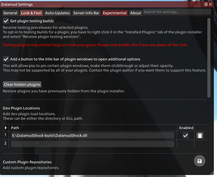 - Go back to your Installed plugins, open the "DalamudShock" settings window and add your details. saving occurs automatically so there's no need to stress over it :3